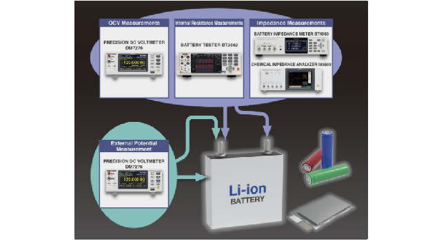 - Para medições OCV, resistência interna e potencial externo de células de baterias